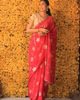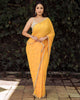 Considered as the most light weight saree, it is easier to drape and handle. The saree comes with all over golden butti and meenakari design on the border. It can be worn anytime and for any function. The saree has a georgette base with an unstitched blouse piece.