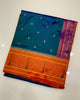 Step into timeless elegance with this Blue Pure Silk Paithani, intricately woven with delicate Muniya butties and enhanced by a rich Red Zari Chataie border. The striking colour contrast and lustrous silk texture make it a perfect pick for festive and traditional occasions.